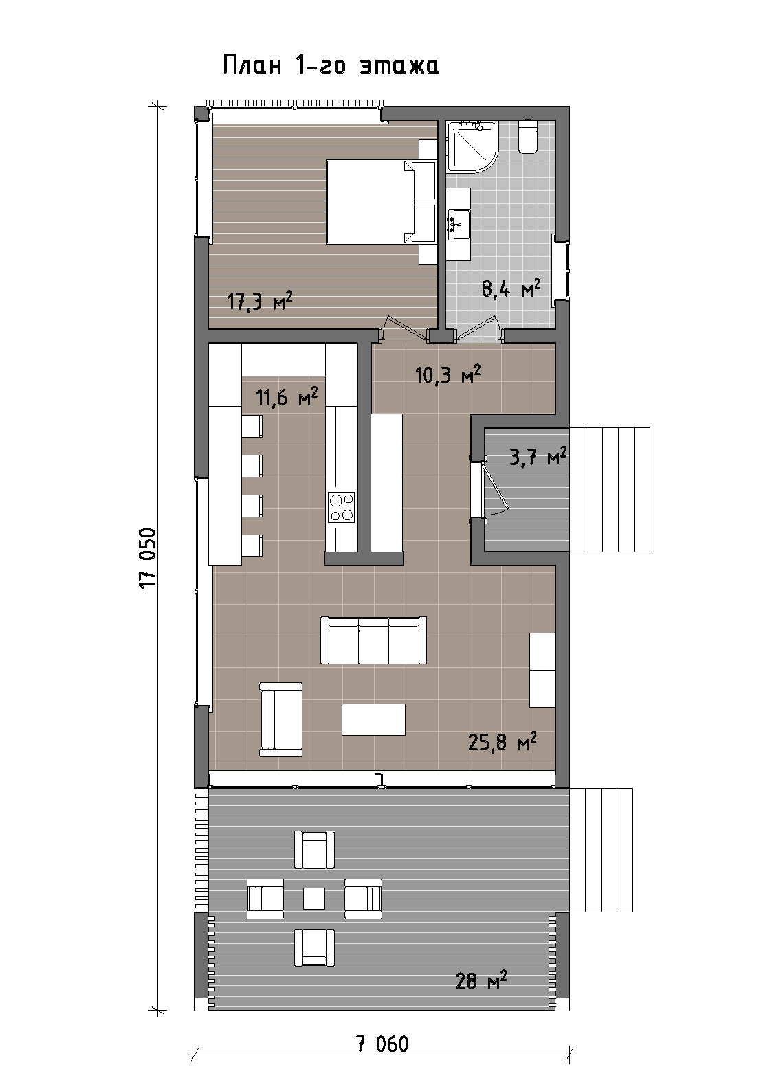 Планировочное решение ориентировано на комфорт повседневной жизни: общественная зона организована как единое пространство кухни, столовой и гостиной с прямым выходом на террасу. Приватная часть включает спальню и функциональные вспомогательные помещения, обеспечивающие удобство использования дома в любое время года.