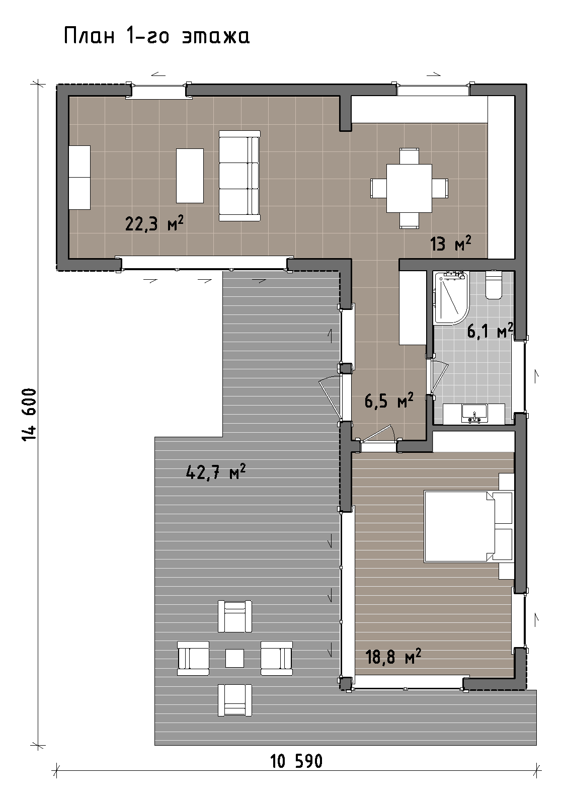 Планировочное решение ориентировано на комфортное проживание. Общественная зона объединяет кухню, столовую и гостиную, создавая открытое пространство для общения и отдыха. Приватная часть дома включает спальню и необходимые вспомогательные помещения, обеспечивая уединение и функциональность без избыточности.