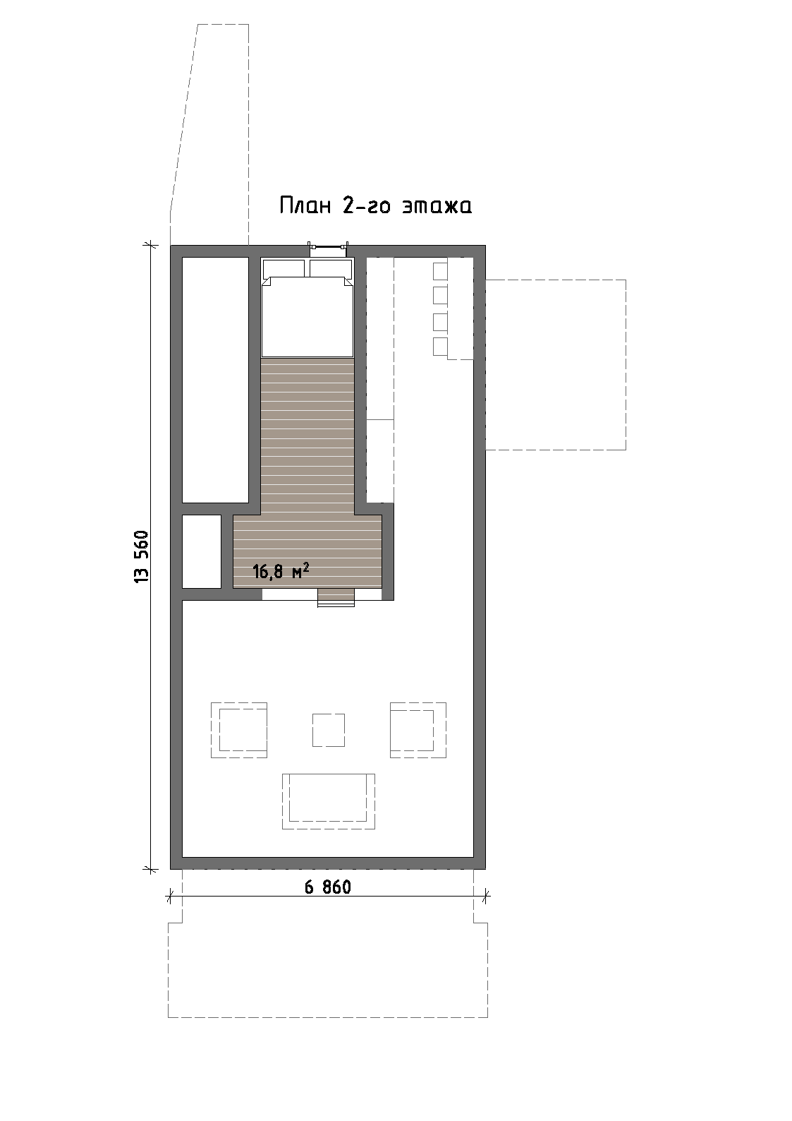 Второй уровень решён как приватная зона. Он включает спальню и дополнительное пространство, которое может использоваться как лаунж-зона или место для уединённого отдыха. Благодаря открытой геометрии и визуальной связи с первым этажом создаётся ощущение единого архитектурного объёма.