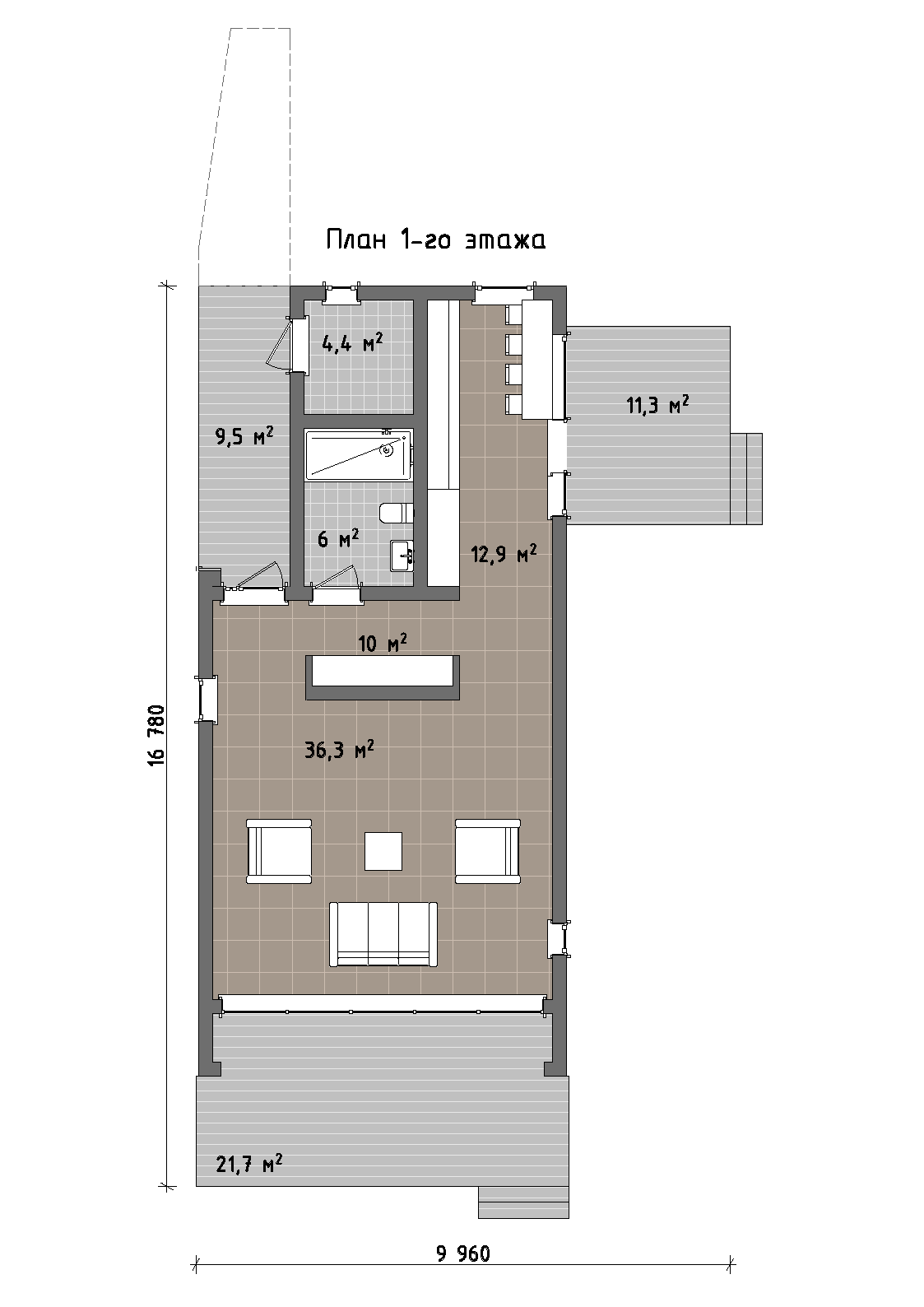 В основе планировки - просторная общественная зона первого этажа с объединённой кухней, столовой и гостиной. Высокие потолки усиливают ощущение объёма, а выход на террасу превращает внутреннее пространство в продолжение участка, создавая комфортную среду для отдыха и приёма гостей. Здесь же предусмотрены функциональные помещения - санузел, техническая зона и вспомогательные пространства, обеспечивающие удобство повседневной жизни.