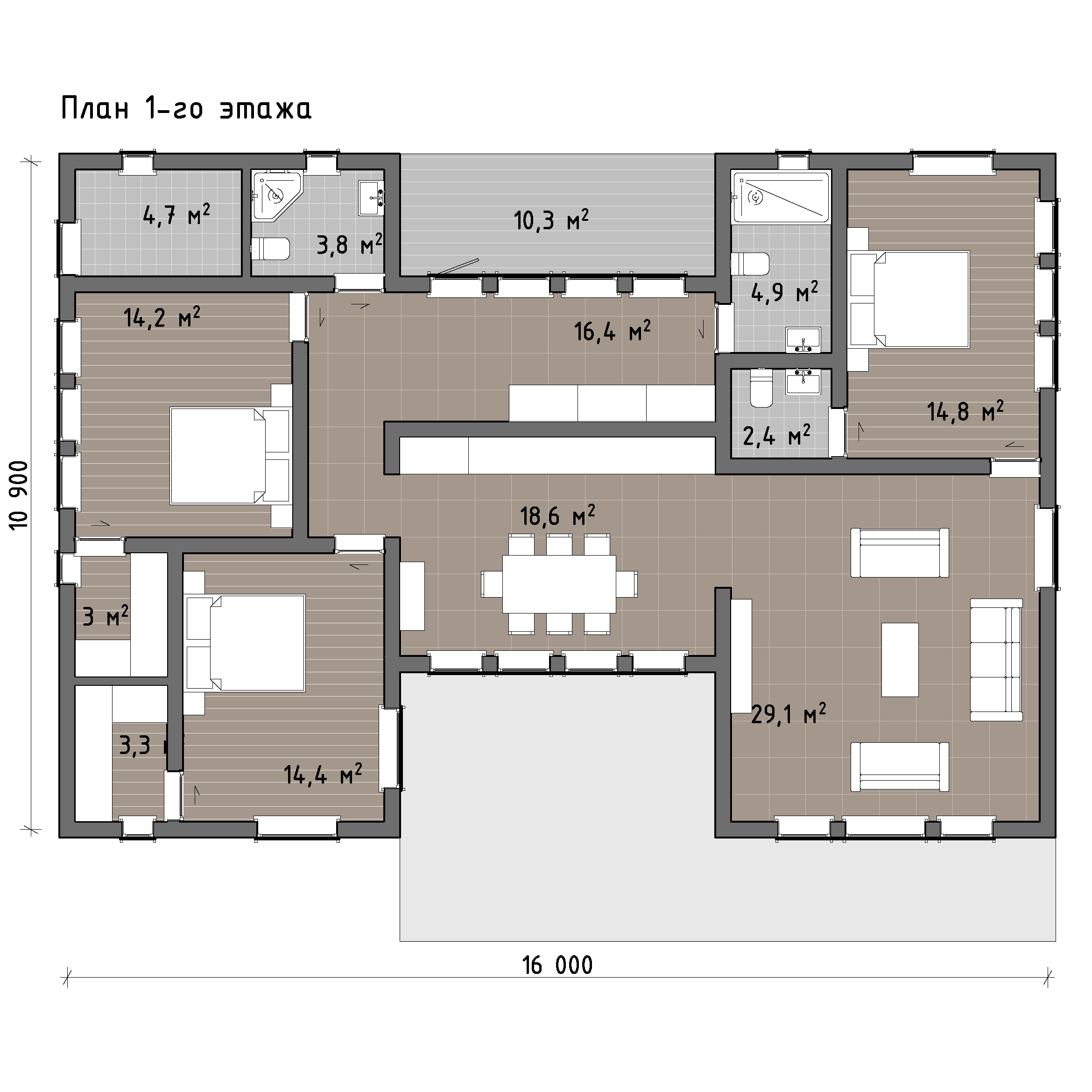 Инженерно-бытовая часть продумана не менее тщательно: в доме предусмотрено несколько санузлов, что особенно важно при одновременном проживании нескольких человек. Холл и коридоры не выглядят транзитными «потерями» площади, а работают как связующее пространство, обеспечивающее удобную навигацию между зонами. В результате получился сбалансированный одноэтажный дом для комфортного круглогодичного проживания за городом.