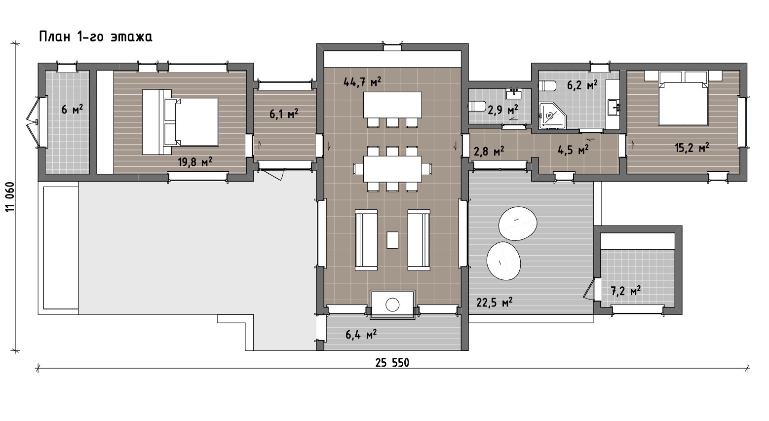 Жилые комнаты расположены таким образом, чтобы обеспечить каждому члену семьи личное пространство. Спальни отделены от общей зоны, что создаёт ощущение уединения и комфорта. Планировка подойдёт как для постоянного проживания, так и для длительных загородных выходных: в доме достаточно места и для повседневной жизни, и для приёма гостей.