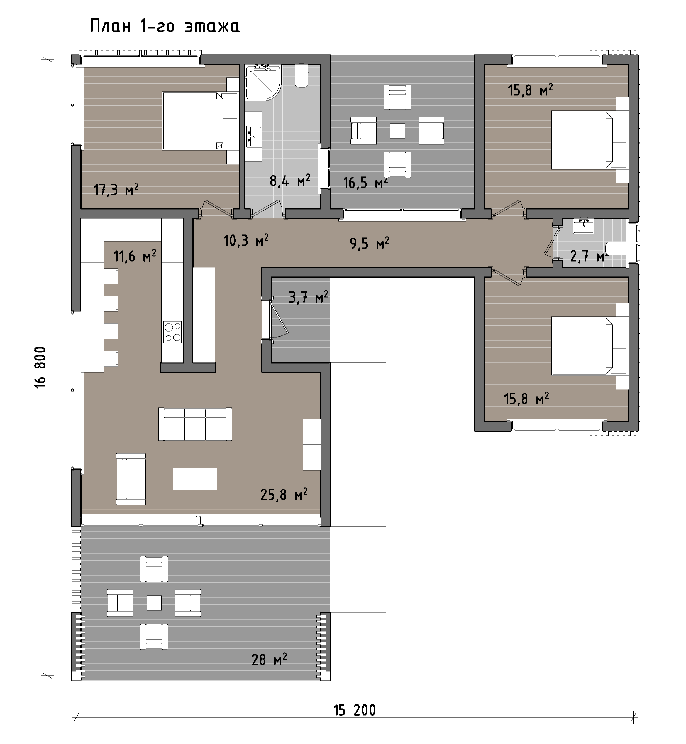 Планировка продумана под короткие выезды и полноценный семейный отдых. Центральное пространство - кухня-гостиная около 26 м² с удобной рабочей зоной и местом для общей посадки. Рядом предусмотрена отдельная комната отдыха/лаунж примерно 16,5 м² - ее можно использовать как тихую гостиную, игровую или кабинет. Приватный блок включает три спальни (около 17,3 м² и две по 15,8 м²), что удобно для семьи с детьми или размещения гостей. Санузлы разведены по функционалу: полноценная ванная около 8,4 м² и дополнительный гостевой санузел около 2,7 м² - комфортно, когда в доме несколько человек.