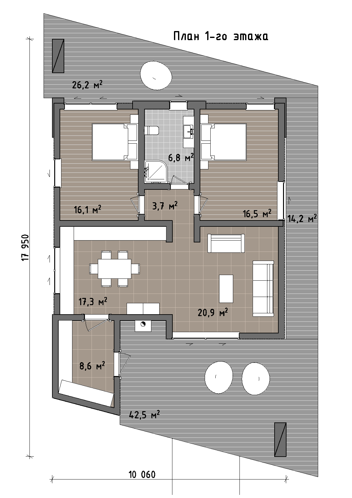 Планировочное решение выстроено вокруг единого общественного пространства, объединяющего гостиную и кухонно-обеденную зону. Это сердце дома, ориентированное на террасу и открытые виды, где повседневная жизнь естественно перетекает в отдых на свежем воздухе. Приватная часть включает две изолированные спальни, обеспечивающие комфорт и уединение, а компактный санузел и входная зона с местом хранения формируют продуманную и функциональную структуру.