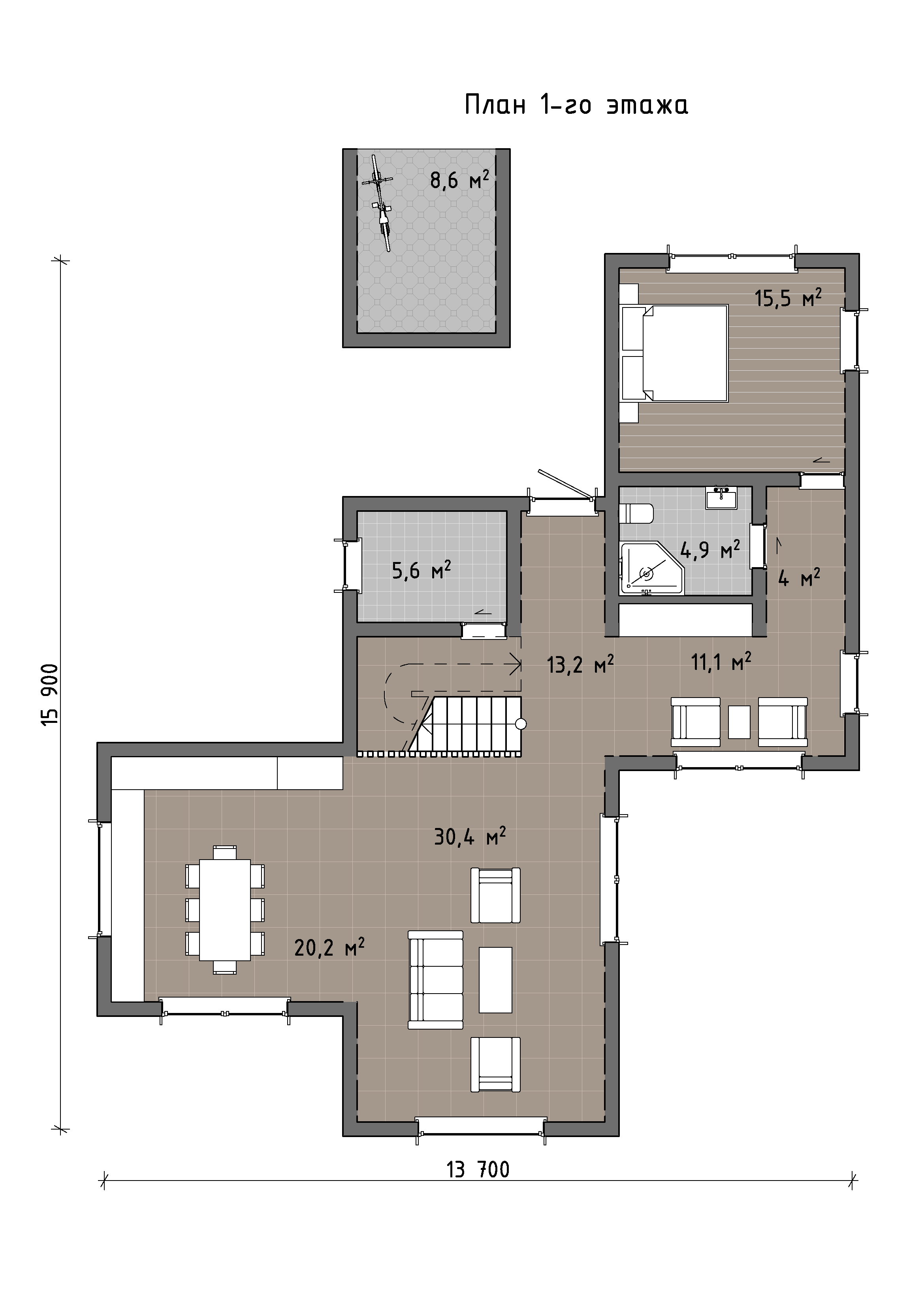 Планировка первого этажа организована вокруг просторной общей зоны. Гостиная, столовая и кухня объединены в единое светлое пространство - это центр повседневной жизни дома, рассчитанный на комфортное общение и приём гостей. Пространство раскрывается за счёт больших окон, но остаётся камерным и уютным.