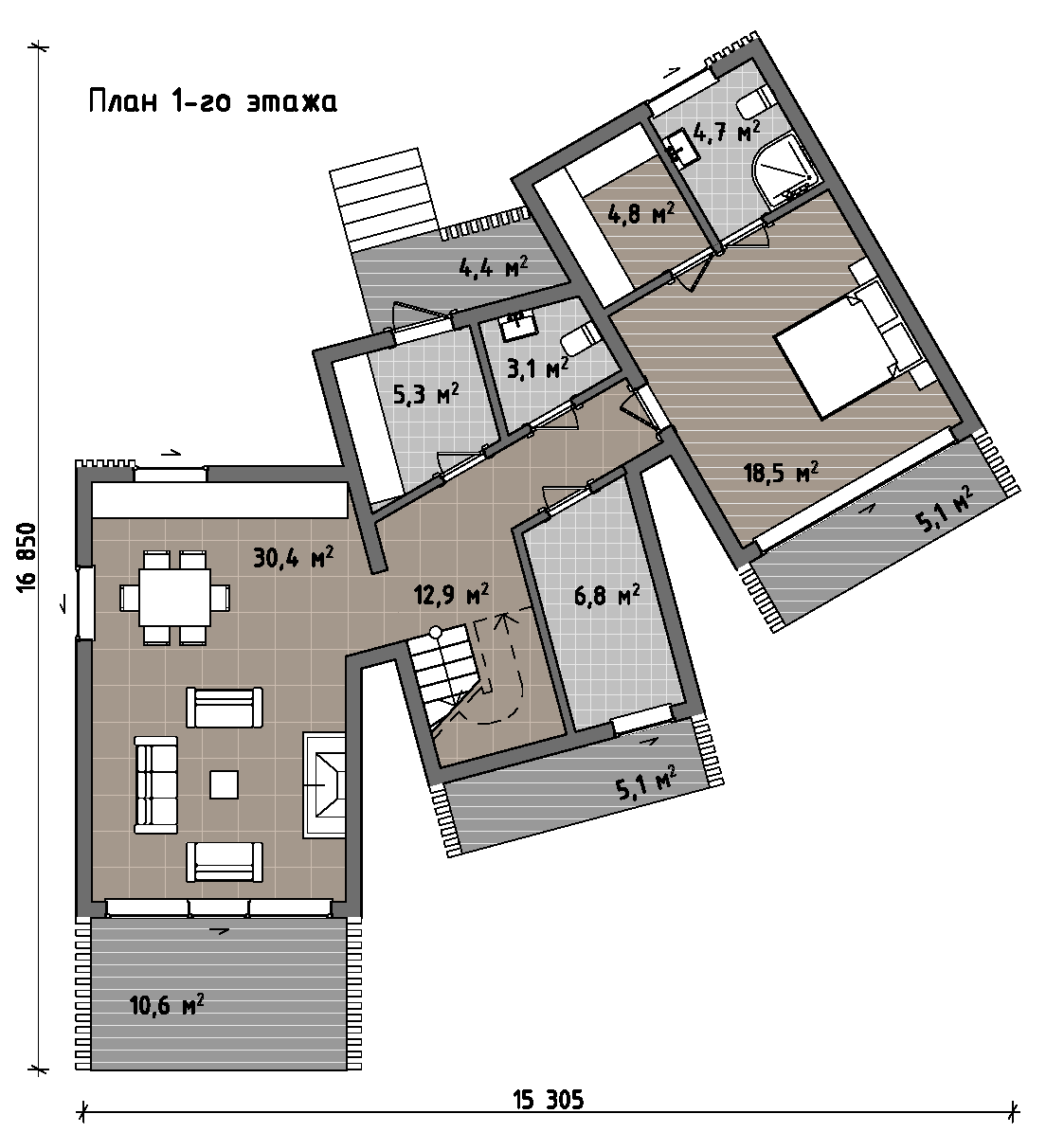 Планировка первого этажа выстроена вокруг просторной общей зоны гостиной и кухни-столовой. Это единое светлое пространство с выходом на террасу формирует центр жизни дома - место для семейных вечеров, встреч с друзьями и отдыха с видом на участок. Рядом расположены приватные помещения: спальня, санузлы, гардеробные и хозяйственные зоны, которые удобно интегрированы в общий сценарий проживания и не перегружают центральное пространство.