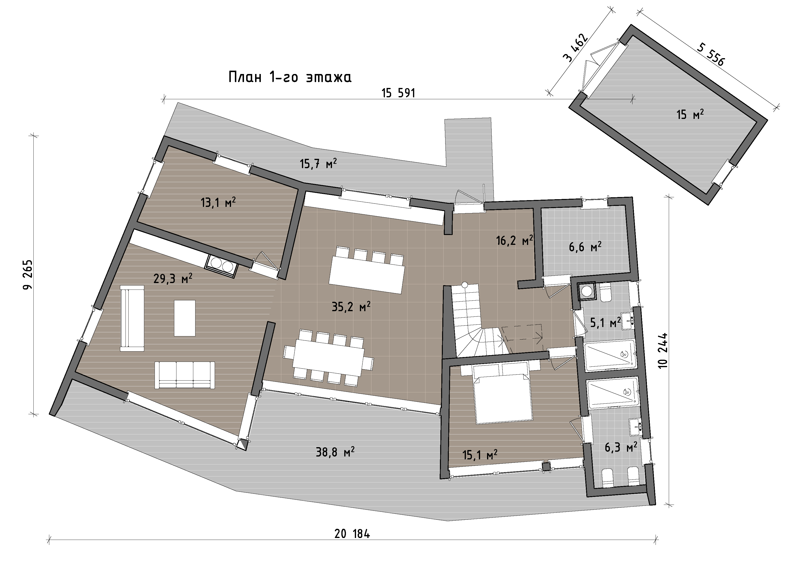 Входная группа спроектирована не как формальный тамбур, а как полноценное пространство с возможностью размещения систем хранения. Техническое помещение изолировано от жилых зон, что позволяет грамотно организовать инженерные системы без ущерба для комфорта. На первом этаже также расположена отдельная спальня - удобное решение для гостей, старшего поколения или как универсальная комната на будущее.