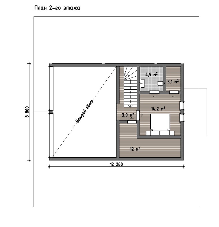 На первом уровне размещены спальни и технические помещения, что делает дом удобным для постоянного проживания без необходимости часто подниматься наверх. Второй этаж представляет собой антресольный уровень с мастер спальней и дополнительным помещениями, которые можно использовать как кабинет, зону отдыха или гостевую комнату. Пространство второго света визуально связывает оба уровня и добавляет интерьеру объём.