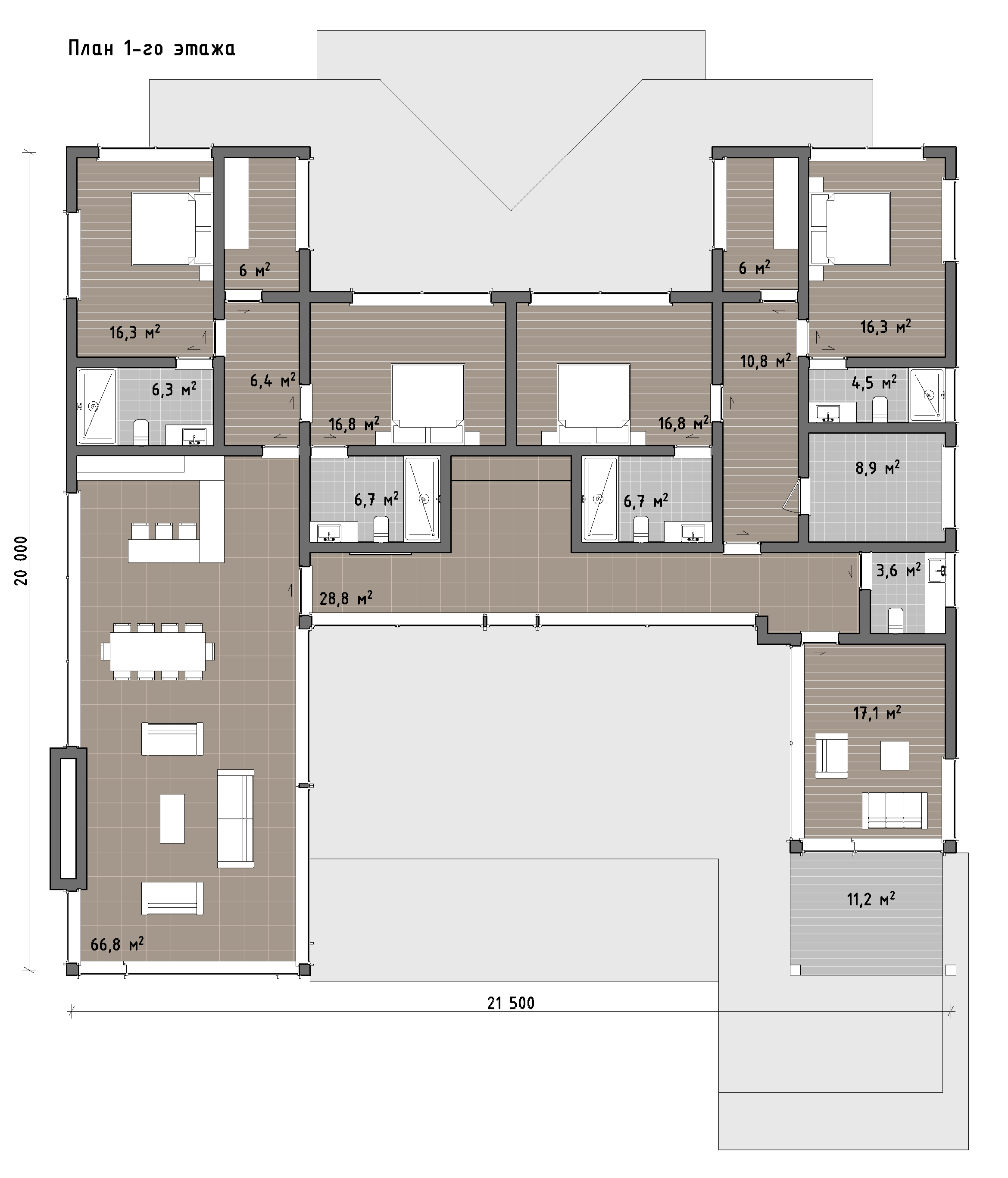 Планировка организована вокруг внутреннего двора, который становится смысловым и визуальным центром дома. Все основные помещения ориентированы на это приватное пространство, благодаря чему интерьер наполнен светом и постоянной связью с природой. Гостиная зона раскрывается во всю ширину фасада, переходя на открытую террасу, где продолжается логика единого жилого пространства без резких границ между интерьером и экстерьером.