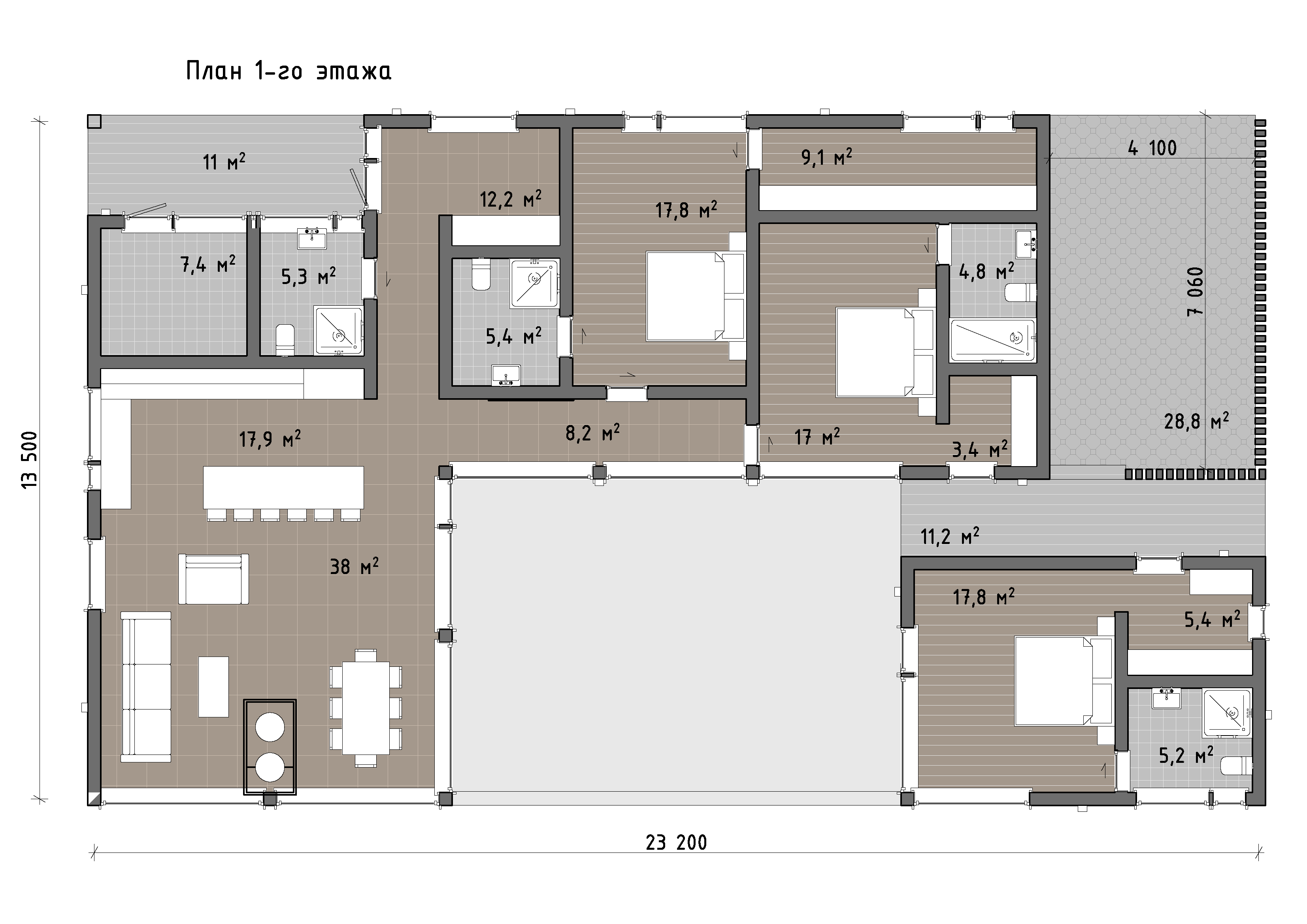 Планировка выстроена вокруг просторной общей зоны, где гостиная, столовая и кухня объединены в цельное светлое пространство. Это сердце дома - место для долгих ужинов, живого общения и тихих вечеров у камина. Благодаря вытянутой форме здания приватные помещения логично отделены от общей части, что обеспечивает комфортное сосуществование разных сценариев жизни под одной крышей.