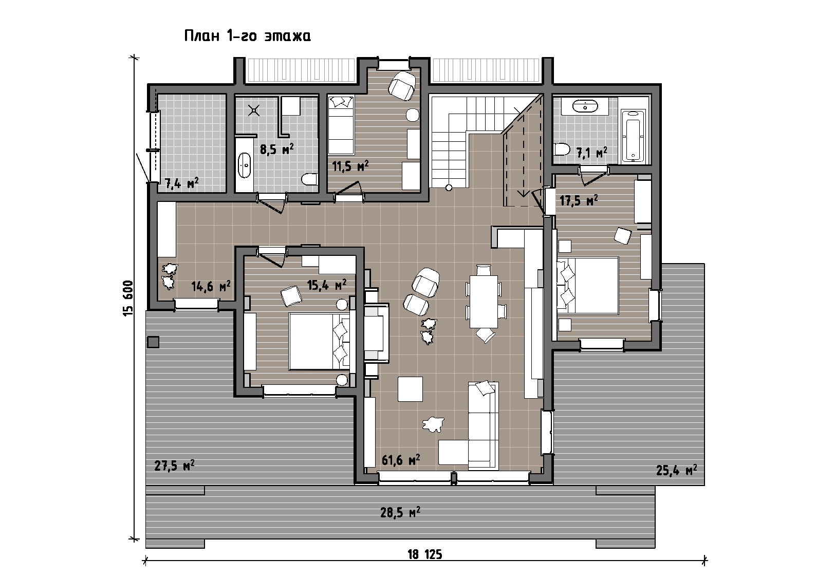 Террасы, примыкающие к дому, становятся естественным продолжением жилого пространства. Они создают сценарии для отдыха на свежем воздухе, семейных ужинов и спокойных утренних часов с видом на участок, усиливая ощущение жизни в гармонии с природой.