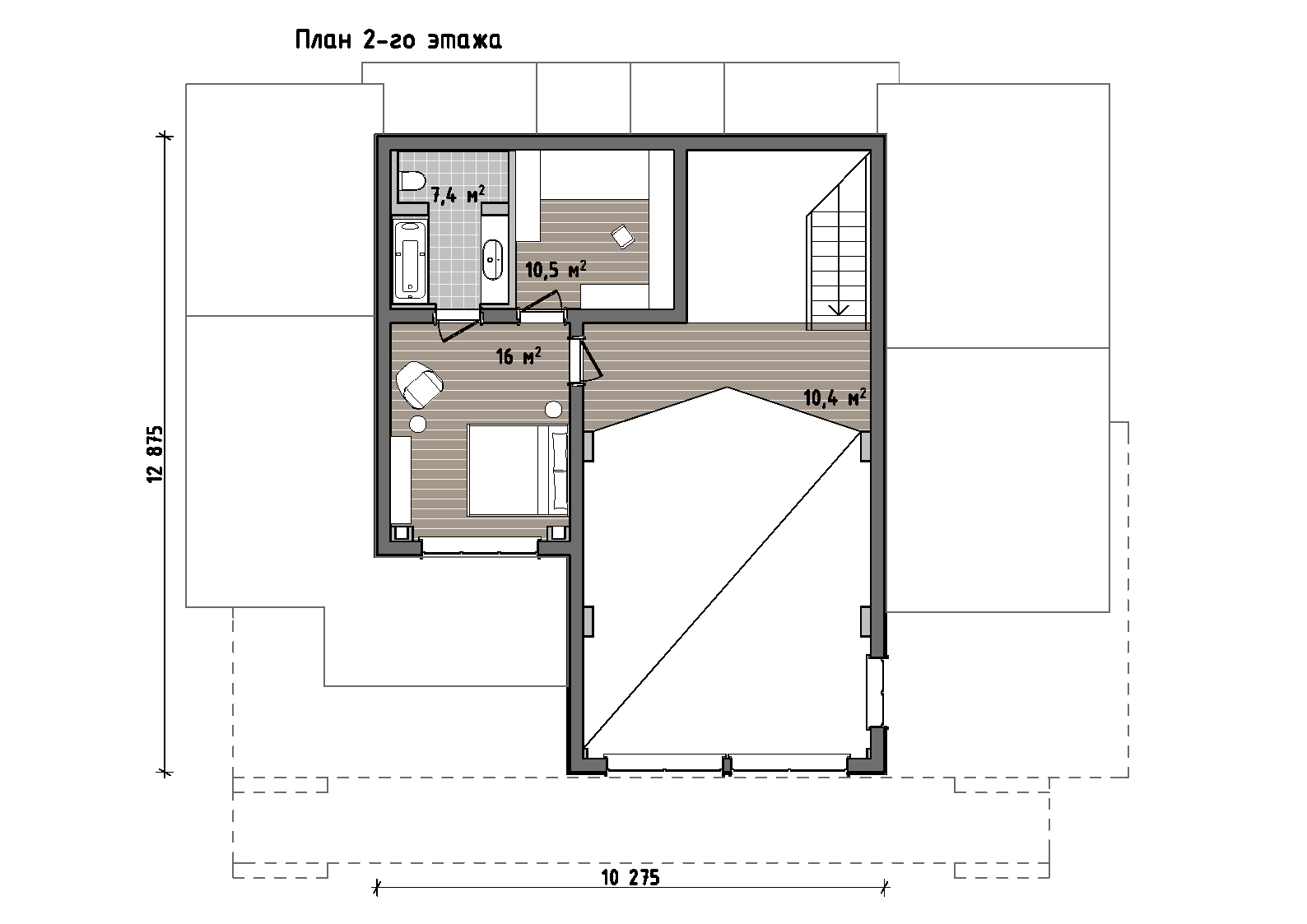 Второй этаж формирует более камерную, приватную среду. Здесь располагаются спальни и помещения для отдыха, организованные вокруг лестничного узла. Такое решение позволяет сохранить ощущение уединения, при этом поддерживая логичную связь между этажами и общими зонами дома.