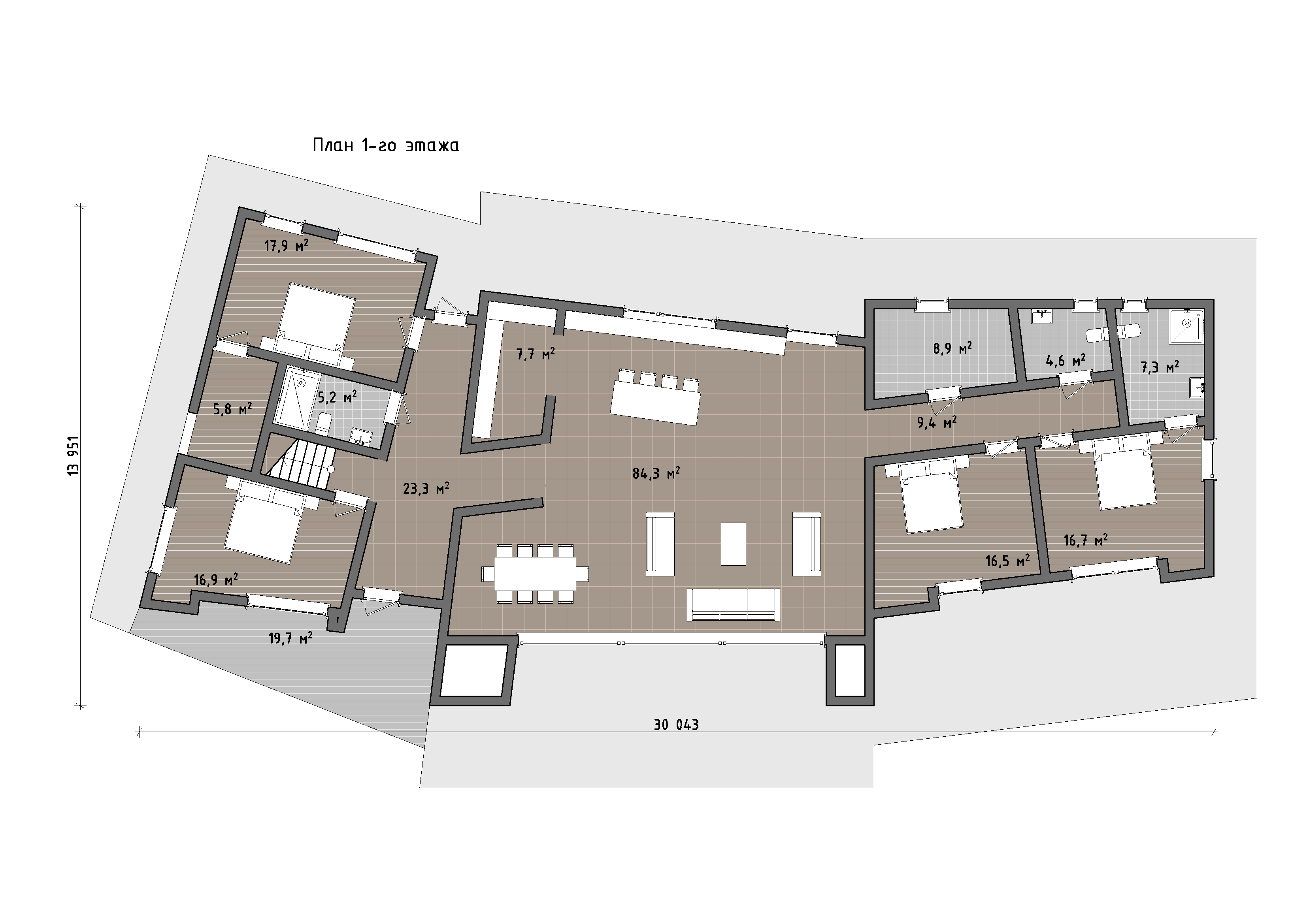 Планировка первого этажа выстроена вокруг просторной общей зоны. Центральное пространство гостиной, кухни и столовой решено как единый объём с большими витражами и выходом на широкую террасу, ориентированную на пейзаж. Благодаря изломанной линии фасада интерьер получает разнообразные ракурсы и естественное зонирование без перегородок. Общественная часть отделена от приватных блоков переходами, что создаёт ощущение уединённости даже внутри одного уровня.