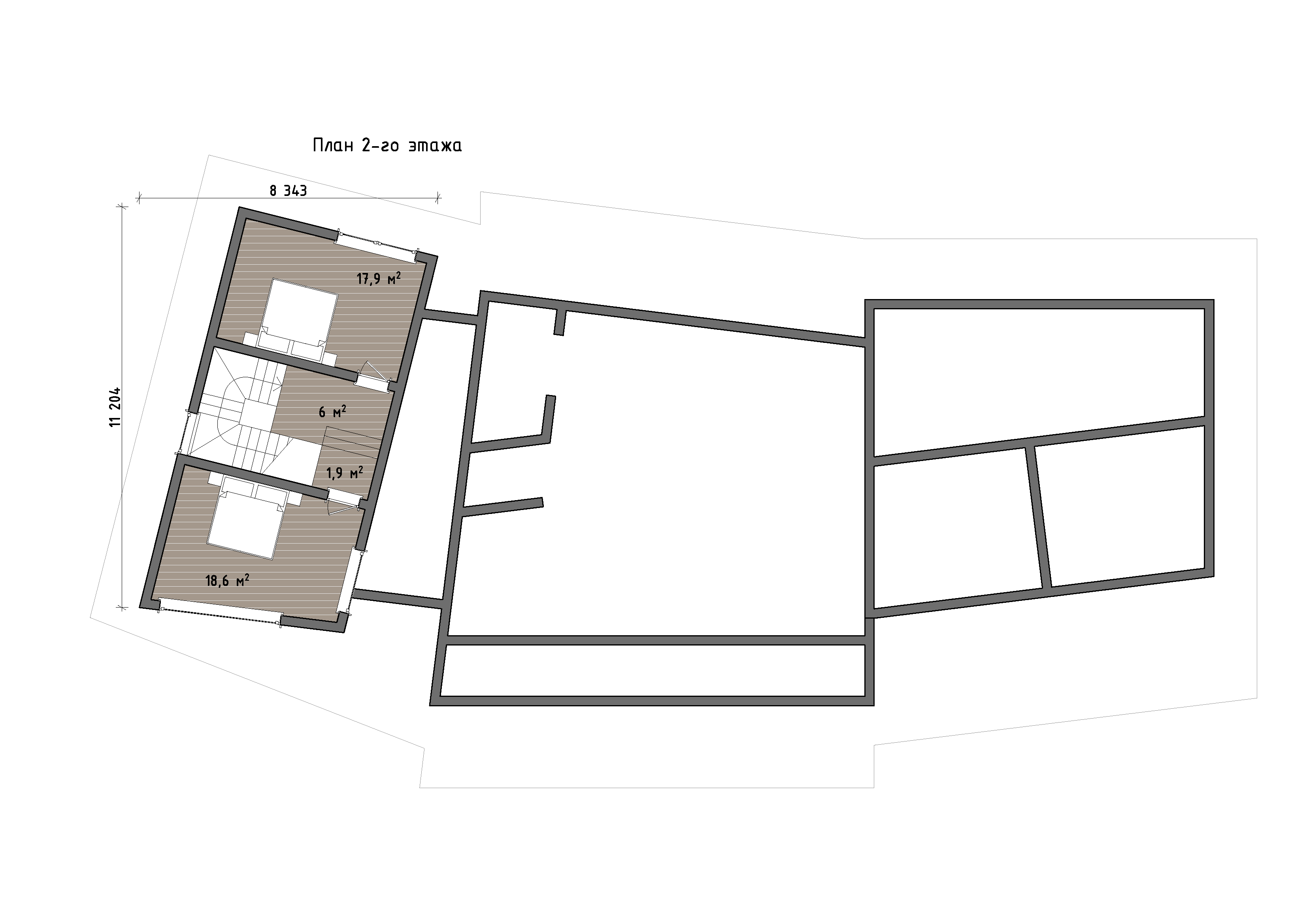 Второй этаж - более камерный уровень. Здесь находятся дополнительные приватные помещения, связанные с первым этажом лестницей в компактном объёме башенного типа. За счёт перепадов высот и формы кровель верхний уровень воспринимается как уединённая зона отдыха, отделённая от динамики общественных пространств внизу. Этот дом подойдёт тем, кто выбирает не типовое жильё, а архитектуру, работающую с местом. Он создан для горного участка, для видов, тишины и ощущения укрытости в природе. Здесь комфорт сочетается с выразительной формой, а каждый внутренний объём логично продолжает пластику фасадов.