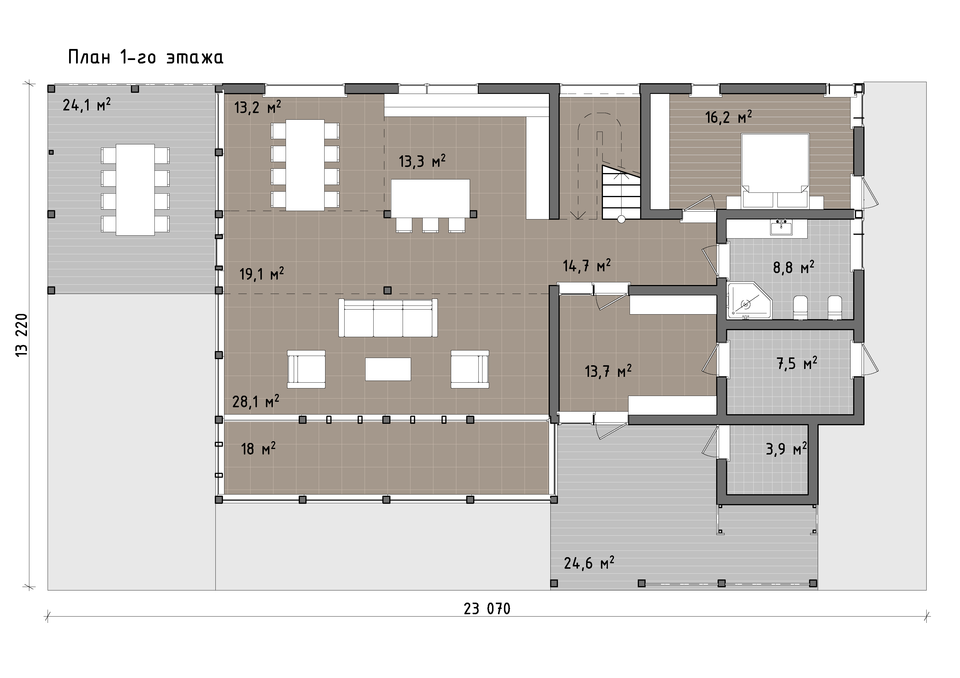 Планировка первого этажа ориентирована на общественную функцию и активную связь с участком. Центральное пространство объединяет кухню, столовую и гостиную в единую зону более 60 м² с панорамным остеклением и выходом на просторную террасу. Отдельно выделена зона хранения и лестничный холл, а также приватный блок с мастер-спальней, гардеробом и санузлом. Дополнительные хозяйственные помещения логично сгруппированы ближе к входной части.