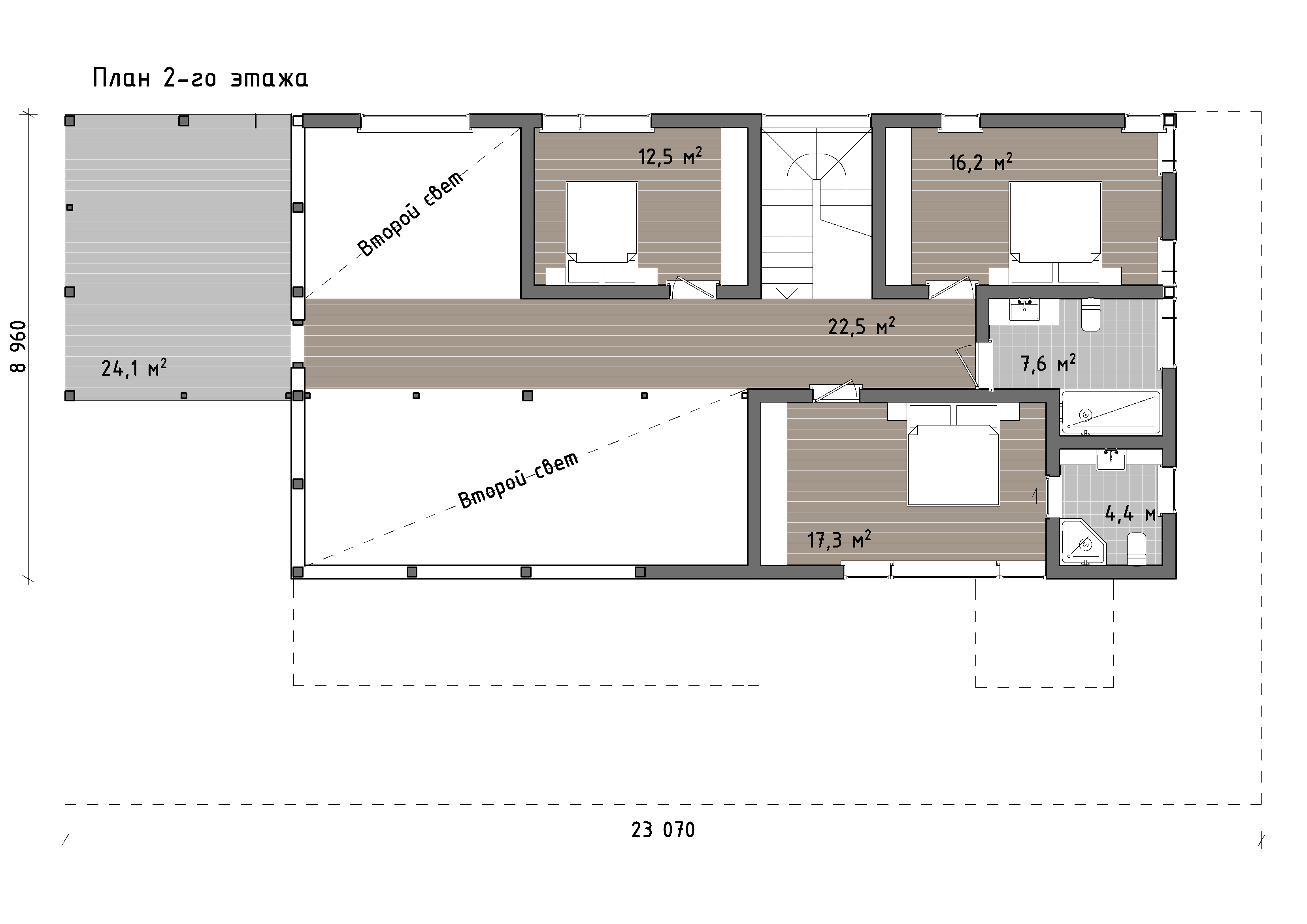 Второй этаж организован как приватный уровень для семьи. Здесь расположены несколько спален, дополнительные санузлы и холл, который может использоваться как игровая или зона отдыха. Часть второго света открывает вид на гостиную и усиливает ощущение объёма в центральной части дома, добавляя интерьеру света и воздуха.