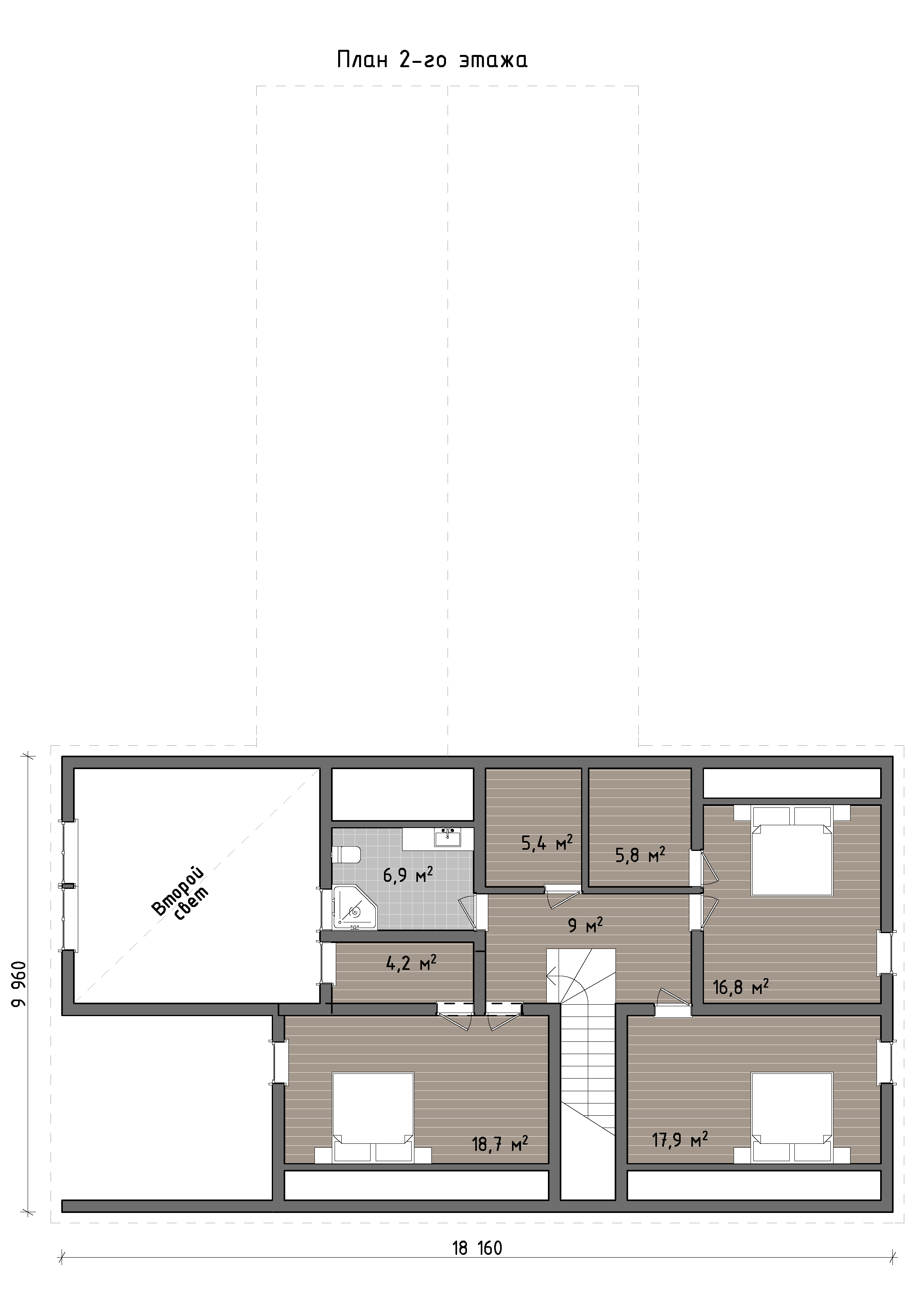 Второй этаж полностью отдан под приватную атмосферу. Здесь располагаются изолированные спальни и дополнительные помещения для хранения, формируя спокойный, камерный уровень для отдыха. Просторный холл объединяет комнаты, сохраняя ощущение уединённости и при этом поддерживая связь между всеми зонами.
