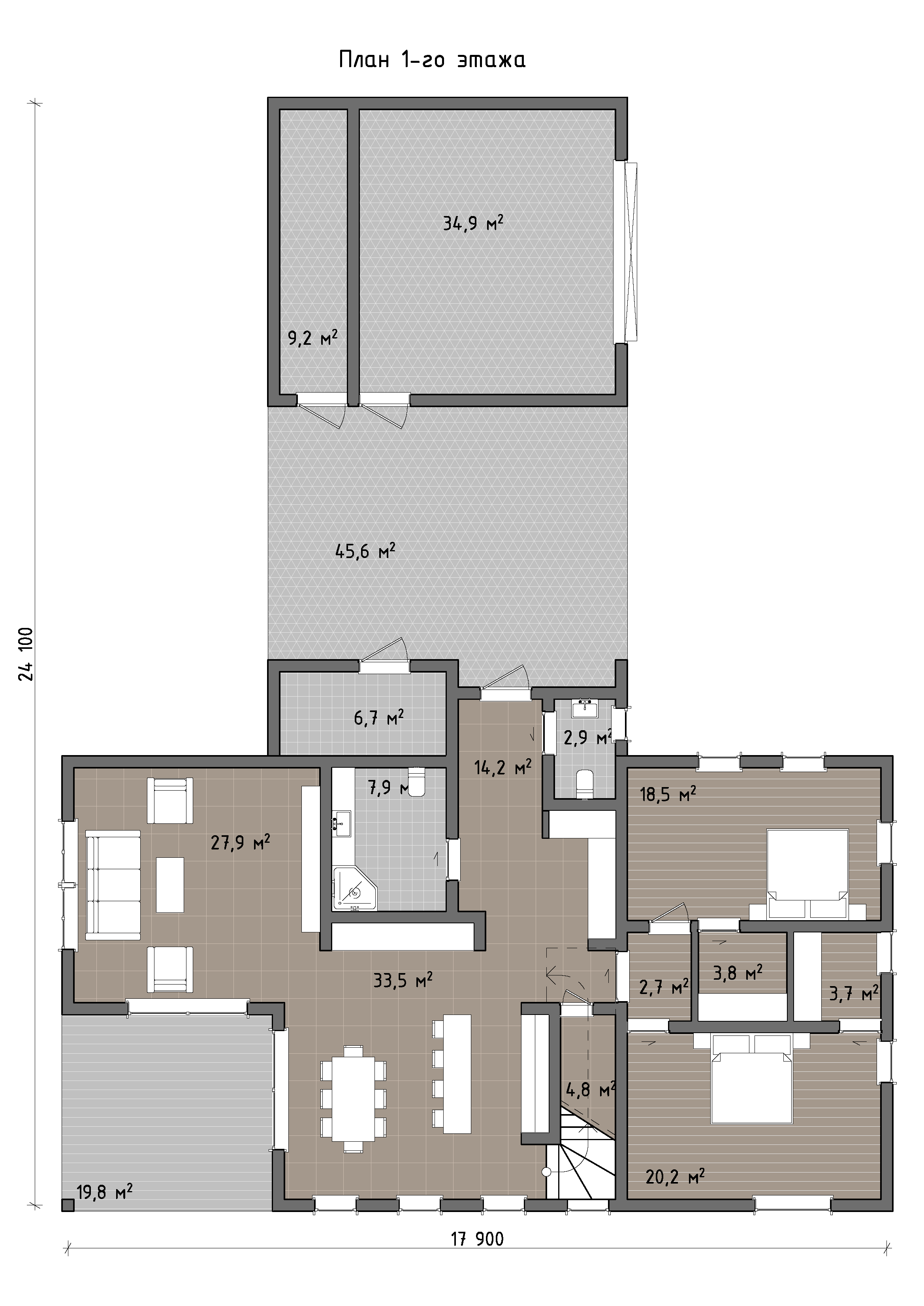 Особое архитектурное достоинство дома - пространство второго света. Оно наполняет интерьер воздухом, усиливает естественное освещение и создаёт выразительную вертикаль, благодаря которой внутреннее пространство выглядит значительно масштабнее и благороднее. В результате дом воспринимается не просто как функциональное жильё, а как современное, статусное пространство для жизни, где комфорт сочетается с архитектурной выразительностью.
