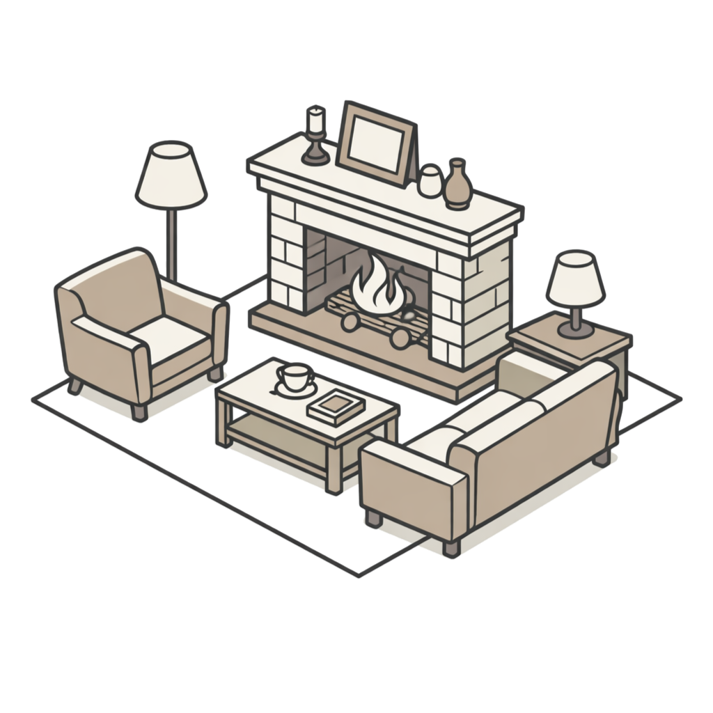Планировка выстроена так, чтобы общие пространства стали центром притяжения для семьи и гостей. Сердцем дома является просторный каминный зал - высокий, наполненный светом и видами на природу. Это главное место встреч, отдыха после активного дня и тихих вечеров у огня. Рядом расположена кухня-столовая, логично связанная с гостиной, что делает пространство удобным для приёма гостей и совместного времяпрепровождения.
