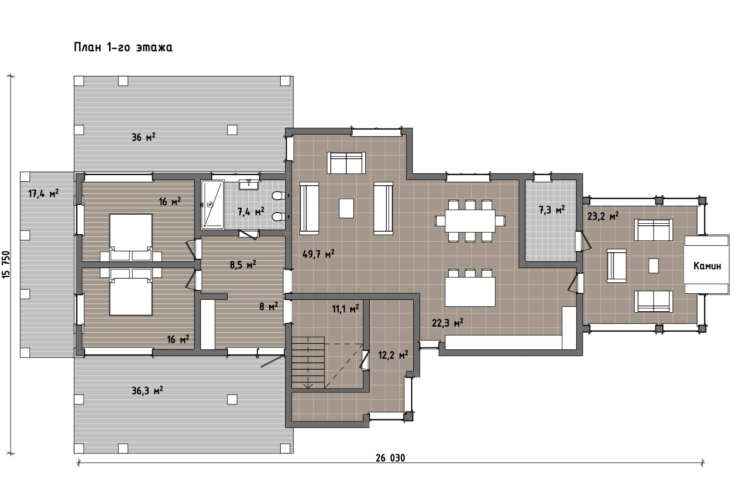 Большое количество крытых террас и переходных пространств позволяет пользоваться внешней средой в любую погоду, а выразительные каменные фасады и мощные конструктивные элементы делают дом не только эффектным, но и по-настоящему надёжным. Это дом для тех, кто ценит масштаб, природу и атмосферу живого огня в центре семейной жизни.