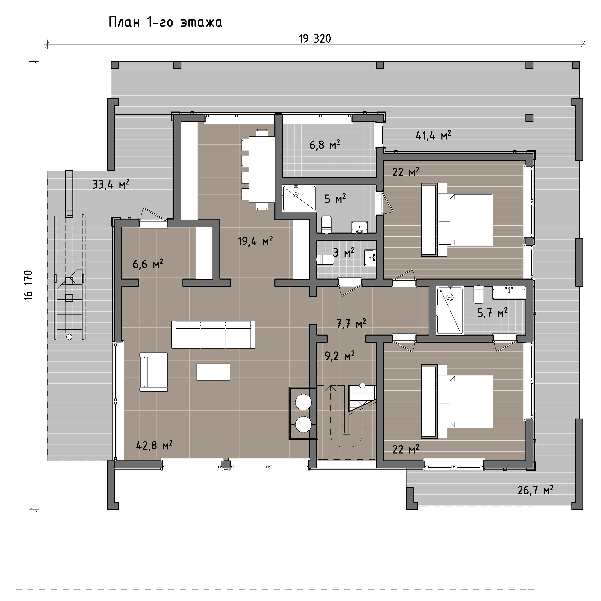 В итоге это не просто дом, а полноценное загородное пространство для жизни, отдыха и приёма гостей. Проект подойдёт для большой семьи, которая ценит простор, приватность и архитектуру с характером. Он будет идеален для тех, кто хочет жить за городом с ощущением резиденции - с широкими террасами, светлыми интерьерами и чётким разделением общественных и приватных зон.