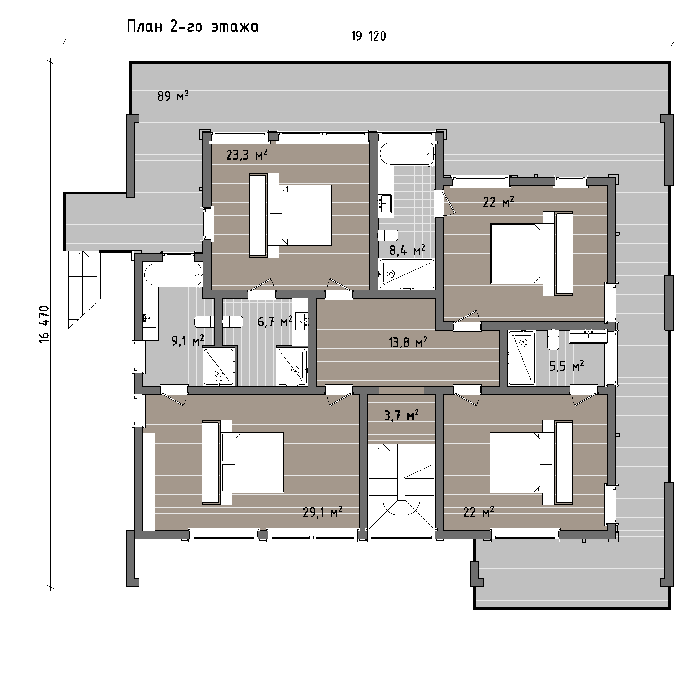 Второй этаж полностью отведён под спальную зону. Здесь находятся четыре изолированные комнаты комфортной площади, каждая из которых может стать полноценной хозяйской или детской спальней с местом для хранения и личной зоны отдыха. Санузлы расположены рядом со спальнями, что делает этаж максимально удобным для повседневной жизни семьи. Проходная зона у лестницы выполняет исключительно распределительную функцию, без лишних “пустых” площадей.